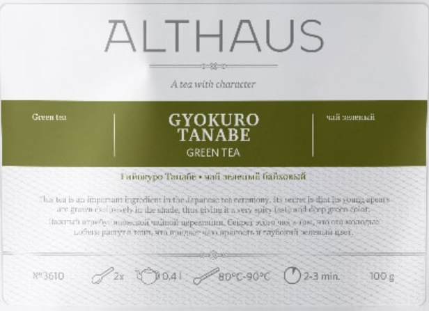Althaus чай Gyokuro Tanabe/Гийокуро Танабе («Жемчужная Роса») - известен как «чай гениев», так как оказывает благоприятное стимулирующее воздействие на организм. Зелёный листовой чай родом из Японии является самым важным ингредиентом японской чайной церемонии. Он изготавливается из молодых листьев, выращенных в тени, что придаёт чаю пряность, он обладает насыщенным вкусом и глубоким зеленым цветом.