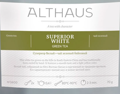 Althaus Superior White («Супериор Белый») , зеленый байховый листовой - Изысканный белый чай с целыми раскрывшимися листьями, которые традиционно собираются вручную в горах Юго-Восточного Китая. Для этого чая высочайшего качества используют только самые молодые почки.