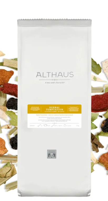 Травяные чаи также не содержат в своем составе чайного листа. Сорта Альтхаус представляют собой изысканную смесь разнообразных трав, листьев, лепестков, ягод, кореньев, семян и пряностей. Условно их можно разделить по следующим направлениям: смеси на основе лекарственных трав (зверобоя, женьшеня и некоторых других) подойдут тем, кто тщательно следит за здоровьем и стремится быть в отличном настроении; настои из различных трав и цветков. Листовой чай Althaus — это лучшие сорта традиционного чая из ведущих чаеводческих районов мира, а также высококачественные фруктовые и травяные смеси.