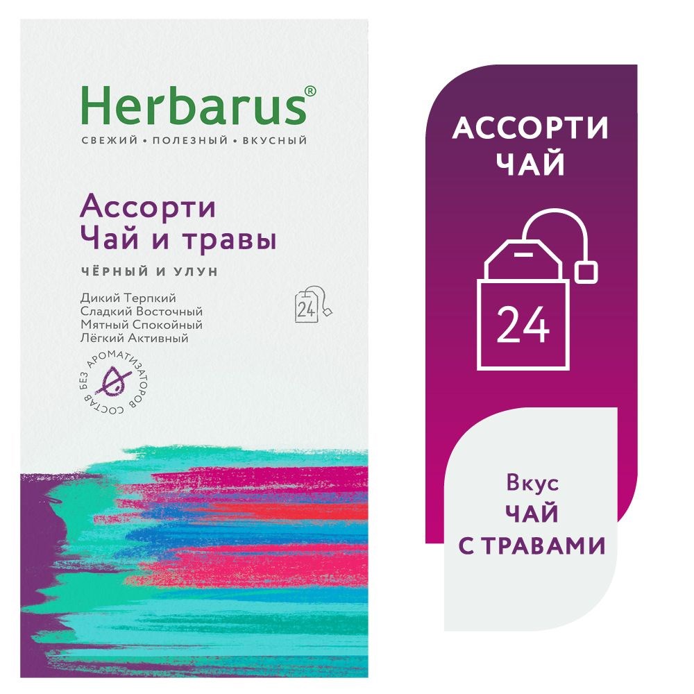 Яркий неповторимый вкус и только натуральные ингредиенты – перед вами чай и чайные напитки HERBARUS.● Полезный, без ароматизаторов и заменителей вкуса В напитках HERBARUS – только натуральные ингредиенты, тщательно сбалансированные титестерами. Оригинальные композиции созданы на основе чая, трав, ягод и фруктов. Их полезные свойства дополняют друг друга – чтобы вы могли пить чай в течение всего дня. Сколько хотите.● Вкусный Благодаря оригинальной рецептуре наши напитки обладают ярким и неповторимым вкусом. Даже композиции из привычных ингредиентов способны вас удивить. ● Свежий Чай должен быть свежим. Только в этом случае он будет по-настоящему вкусным и ароматным. Набор популярных купажей Черного и Зеленого чая Гербарус в одной упаковке "Ассорти" - позволит познакомиться с неповторимыми вкусами!Черный чай в пакетиках с добавками Herbarus "Дикий Пряный", 6 пак.Благородное сочетание чёрного цейлонского чая с ярким пряным акцентом чабреца, смягчённое мятой и дополненное пикантной ноткой фенхеля. Хорошо утоляет жажду, подходит для употребления в горячем и холодном виде.Черный чай в пакетиках с добавками Herbarus "Сладкий Восточный", 6 пак.Вкус полный, изысканный с оттенками сладкого яблока, приправленных корицей и фенхелем. Дарит заряд бодрости и хорошего настроения, прекрасно тонизирует. Рекомендуется пить в первую половину дня.Зеленый чай Улун (Oolong) с Мятой в пакетиках с добавками Herbarus "Мятный Спокойный", 6 пак. Изысканное сочетание зелёного китайского чая со смягчающим действием мяты и лёгким цитрусовым вкусом и ароматом лимонной травы. Хорошо утоляет жажду, особенно хорош для употребления в жаркую погоду. Обладает умеренным тонизирующим действием.Зеленый чай Улун (Oolong) с Имбирем в пакетиках с добавками Herbarus "Легкий Активный", 6 пак. Яркая бодрящая композиция из китайского улуна и имбиря, смягчённого нежным вкусом спелого яблока. Обладает лёгким тонизирующим и согревающим действием. Хорошо сочетается с мёдом.Как заваривать чай ГербарусЗалейте пакетик водой при температуре 95°C и подождите 7-10 минут. Травы и ягоды раскрываются постепенно, делая настой более насыщенным, аромат – чарующим, а вкус – ярким, многогранным и богатым.