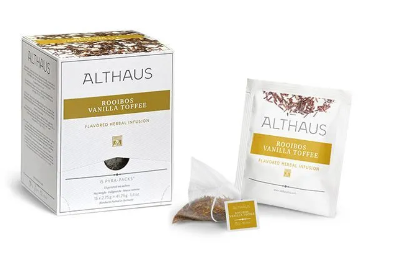 Rooibus Vanilla Toffee- Изысканный букет pойбуша в сочетании со сладкой карамелью, миндалем и нежной ванилью создают превосходный напиток с тонкой сладостью вкуса.Чайные пирамидки Althaus Pyra-Pack - это качественный листовой чай в инновационном формате фасовки. Пирамидки изготовлены из нейлона, который никак не влияет на свойства напитка, поскольку не обладает запахом и не разрушается под действием кипятка. Чайные листочки, не стесненные легким, почти невесомым материалом, который благодаря своей сетчатой структуре обладает отличной пропускной способностью, моментально насыщаются влагой и быстро раскрываются, отдавая максимум вкусовых и ароматических веществ в настой. Чай в пирамидках получается особо насыщенным и душистым, как и рассыпной чай Althaus.