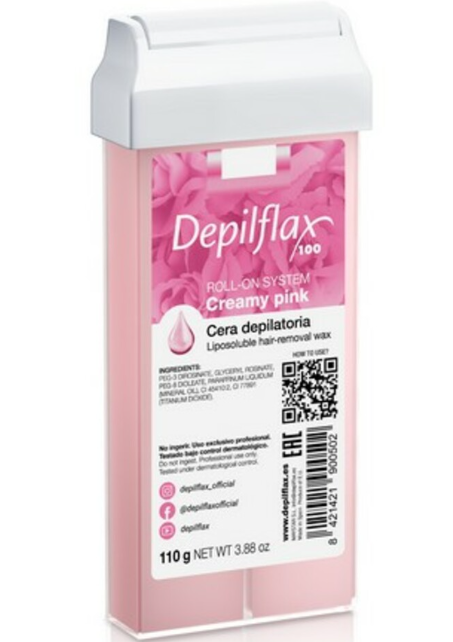 Плотный воск от бренда Depilflax100 - Розовый-сливочный в картридже. Подходит для всех видов волос и чувствительной кожи.