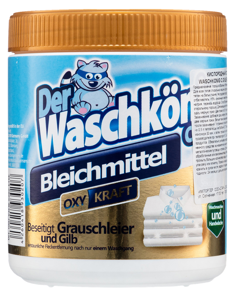 Waschkonig OXY Kraft Пятновыводитель белый 750г Кислородный отбеливатель немецкого производства Der Waschkönig CG успешно подходит для стирки и замачивания. Активная формула нового поколения, содержащаяся в пятновыводителе, гарантирует эффективное удаление стойких пятен с белых тканей и возвращает им белоснежный вид.