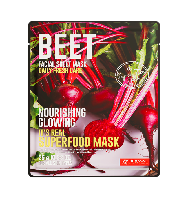 Линейка масок It’s Real Super Food Mask корейского бренда Dermal на основе экстрактов продуктов с высокой питательной ценностью являются простым и эффективным способом ухода за кожей. Маски в своем составе содержат суперфуды, которые способны оказать сильное воздействие на кожу и улучшить ее состояние. Один из таких суперфудов – экстракт свеклы. Свекла содержит большое количество полезных микро- и макроэлементов: витамины группы В, С, РР, биофлавоноиды, железо, кальций, калий, яблочную, лимонную, щавелевую, и фолиевую кислоты. Благодаря содержанию фолиевой кислоте маска с экстрактом свеклы благотворно влияет на кожу, замедляет процессы старения, оказывает омолаживающее действие. Маска успокаивает раздраженную кожу, устраняет раздражения и покраснения на коже, способствует восстановлению водно-жирового баланса кожи. Маска подходит для всех типов кожи, в том числе для жирной и чувствительной кожи. Лекало маски изготовлено из натуральной целлюлозы, за счет чего маска плотно прилегает к коже, позволяя эссенции лучше и быстрее впитываться. Способ применения: на чистую сухую кожу лица нанести маску, расправить ее от центра к внешним краям. Оставить на 15-20 минут. Снять маску и мягко вбить подушечками пальцев оставшуюся эссенцию. Для максимальной эффективности тканевыми масками рекомендуют пользоваться регулярно – 2-3 раза в неделю.