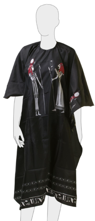 Удобный и практичный пеньюар для стрижки Dewal AP10A35 «Египет» выполнен в черном цвете с оригинальным принтом.