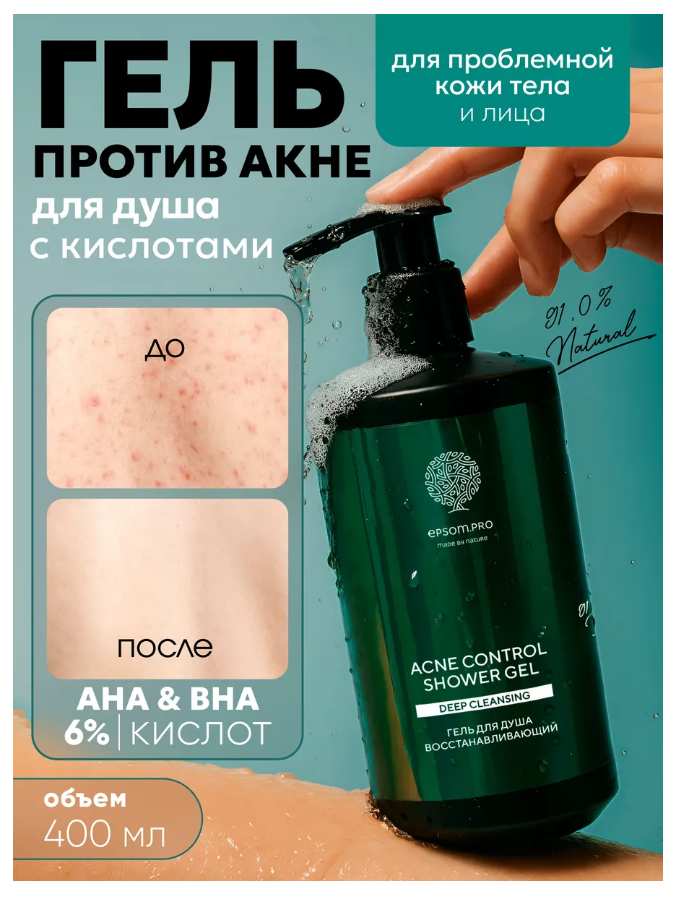 EPSOM.PRO Гель для душа ВОССТАНАВЛИВАЮЩИЙ ACNE CONTROL 400 мл - подходит для тела и лица, предназначен для проблемной кожи очищающий гель для душа с 6% кислот, мощное средство для ухода за проблемной кожей. Он мягко отшелушивает ороговевшие клетки предотвращает появление черных точек и выравнивает тон, снижая воспаление. Благодаря салициловой, гликолевой, молочной и азелаиновой кислотам, он уменьшает постакне, пигментацию и шелушения, а также регулирует работу сальных желёз .Цинк обладает антисептическими свойствами , уменьшает воспаление и предотвращает новые высыпания. Пантенол способствует заживлению повреждений и улучшает общее состояние кожи. Экстракт граната , центеллы и ламинарии обеспечивают антиоксидантную защиту и снимают раздражение. Гель обладает бодрящим и свежим ароматом листа смородины. Подходит для ежедневного использования и для всех типов кожи. В составе нет минеральных масел, парабенов, искусственных красителей и агрессивных ПАВ типа SLS/SLEC.