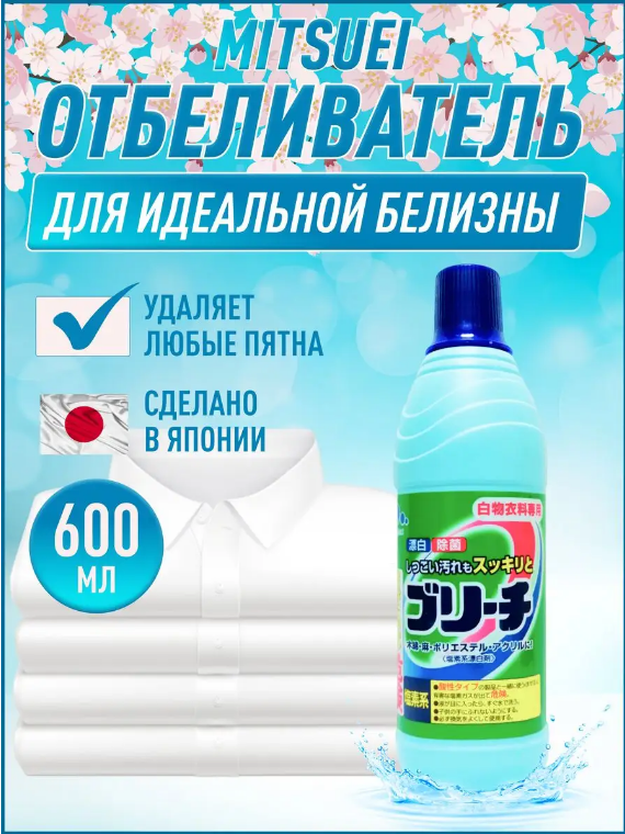 Японский хлорный отбеливатель Mitsuei вернет Вашим вещам сверкающую белизну. Средство для стирки идеально подходит для изделий из хлопка, полиэстера, вискозы и льна. Пятновыводитель прекрасно справляется с загрязнениями на воротничках и манжетах белых рубашек а также идеально подходит для белого белья. Удаляет любые пятна. Придает Вашим вещам приятный аромат чистоты и свежести. Может использоваться как при стирке вручную, так и в стиральной машине. Применение: Для стирки белых вещей к порошку добавить отбеливатель из расчета: на 1 л. воды - 20 мл (1 колпачок) отбеливателя. Состав: Гипохлорид натрия (хлористый), гидроксид натрия. Рекомендуется держать хозяйственный товар дома в недоступном для **детей** месте. Бытовая химия произведена в Японии.
