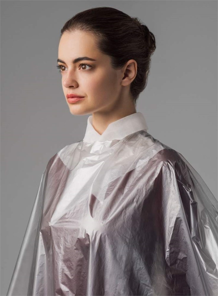 Одноразовые пеньюары из прочного полиэтилена. Препятствуют попаданию воды, краски, лаков или других косметических веществ на одежду клиентов. Используются во время различных парикмахерских процедур. Пеньюары люкс обеспечивают наибольший комфорт. Поставляются в коробке, из которой удобно брать изделие по одному.