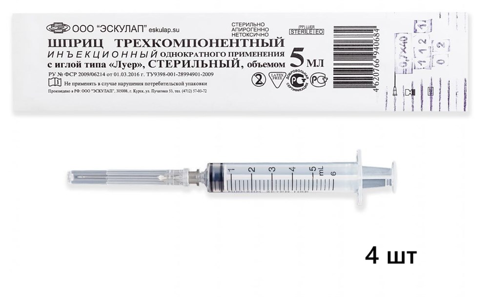 Шприц стандартный трехкомпонентный Луер Лок со стандартной иглой, 5 мл, 4 шт/упк