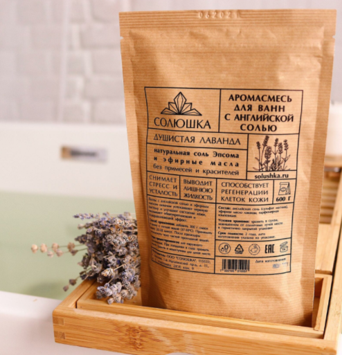 Ванна с Английской солью и эфирным маслом лаванды успокоит нервную систему и улучшит состояние кожи. Аромасмесь будет полезна как детям, так и взрослым в качестве общеукрепляющего и оздоравливающего средства. Сульфат магнезии расслабляет, выводит токсины и шлаки, снимает спазмы и напряжение. Масло лаванды успокаивает, заживляет кожу и нормализует эмоциональный фон.
