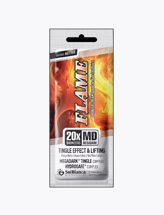 Крем - автозагар Flame с тингл - эффектом, маслом манго, экстрактом арники и красного вина . Профессиональный крем для загара в солярии SolBianca FLAME с Tingle (разогревающим) эффектом создан для настоящих ценителей и позволяет быстрее достичь экстремально темных оттенков загара, одновременно бережно ухаживает за кожей, хорошо увлажняет и смягчает. В основе крема сок алоэ вера и легендарный дуэт. Современный профессиональный автобронзер, комплекс-синергетик MEGADARK PRO, в который наряду с ДГА входит тирозин, редкое масло моринги, а также масло грецкого ореха и экстракт моркови. Комплекс сочетает в себе все 3 необходимых элемента - активаторы, корректоры и пролонгаторы загара, работающие в т.ч. на усиление выработки собственного меланина. Итоговый результат зависит непосредственно от базового оттенка кожи и будет хорошо заметен уже через 3 часа после сеанса. Инновационная система по увлажнению и защите кожи HYDROSAFE на основе успокаивающего пантенола, а также биосахаридного комплекса и модифицированного карбамида обеспечивает интенсивное и глубокое увлажнение кожи, сохраняя естественный водный баланс. Tingle (разогревающий) эффект основан на работе экстракта острейшего перца чили, мощно усиливающего микроциркуляцию крови и ускоряющего обменные процессы, а значит, стимулирующего проявление загара. Экстракты горной арники и красного винограда в креме обладают дополнительным лимфодренажным действием, а тропическое масло манго смягчает кожу, питает ее аминокислотами и микроэлементами, повышает упругость и разглаживает. 20х автобронзер хорошо использовать для второго и последующих этапов загара. Не подходит для чувствительной кожи. Крем обладает эксклюзивной невесомой консистенцией и аппетитным пряно-ягодным ароматом с виноградной нотой.