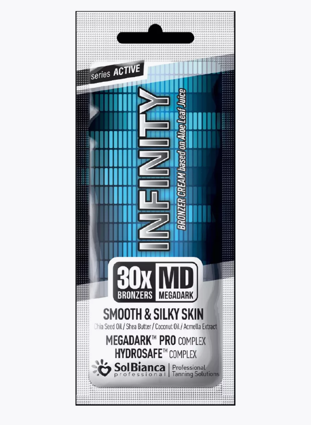 Крем - автозагар Infinity маслом кокоса, маслом Ши, маслом семян чиа и экстрактом акмеллы . Профессиональный крем-релакс для загара в солярии SolBianca INFINITY, богатый биоактивными маслами, обеспечивает ровный глубокий оттенок загара, одновременно интенсивно ухаживает за кожей, питает и увлажняет, делая загар максимально комфортным. В основе крема сок алоэ вера и легендарный дуэт. Современный профессиональный автобронзер, комплекс-синергетик MEGADARK PRO, в который наряду с ДГА входит тирозин, редкое масло моринги, а также масло грецкого ореха и экстракт моркови. Комплекс сочетает в себе все 3 необходимых элемента - активаторы, корректоры и пролонгаторы загара, работающие в т.ч. на усиление выработки собственного меланина. Итоговый результат зависит непосредственно от базового оттенка кожи и будет хорошо заметен уже через 3 часа после сеанса. Инновационная система по увлажнению и защите кожи HYDROSAFE на основе успокаивающего пантенола, а также биосахаридного комплекса и модифицированного карбамида обеспечивает интенсивное и глубокое увлажнение кожи, сохраняя естественный водный баланс. Ценное масло семян чиа, натуральные масла кокоса и карите в составе крема обогащают кожу питательными биокомпонентами, делают ее мягкой и шелковистой, предупреждают шелушение. Экстракт акмеллы, настоящий природный безопасный миорелаксант, снимает мышечное напряжение и способствует разглаживанию преждевременных морщин. 30х автобронзер дарит максимальную интенсивность загара, подойдет в т.ч. для смуглой кожи. Крем обладает эксклюзивной невесомой консистенцией и успокаивающим приятным ароматом кокосового коктейля.