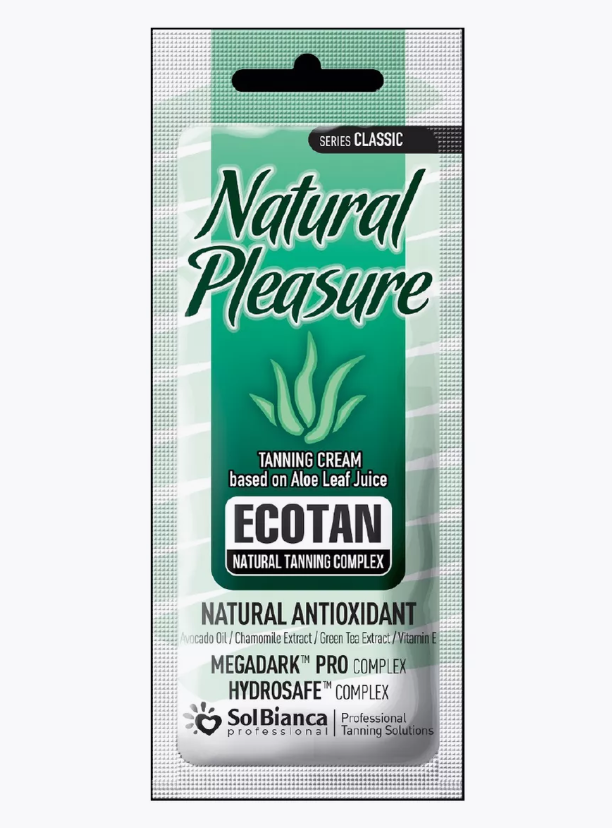 Крем для усиления загара Natural Pleasure с маслом авокадо, экстрактом зеленого чая и витамином Е . Профессиональный омолаживающий крем с натуральным бронзирующим комплексом для загара в солярии SolBianca NATURAL PLEASURE обеспечивает красивый естественный оттенок загара, увлажняет и питает кожу, делая загар максимально комфортным и равномерным. В основе крема сок алоэ вера и легендарный дуэт. Мягкий натуральный бронзер, комплекс ECOTAN, в который входит редкое масло моринги, стимулирующей выработку тирозина в коже, а также масло грецкого ореха и экстракт моркови, активирующих продукцию меланина, что ускоряет проявление загара. Натуральные природные бронзаторы не оставляют разводов и обеспечивают стабильное потемнение кожи, закрепляя полученный результат на длительное время. Инновационная система по увлажнению и защите кожи HYDROSAFE на основе успокаивающего пантенола, а также биосахаридного комплекса и модифицированного карбамида обеспечивает интенсивное и глубокое увлажнение кожи, сохраняя естественный водный баланс. Крем обогащен растительными экстрактами (зеленый чай, ромашка, женьшень), содержащими ценные фитонутриенты с мощным антиоксидантным действием, стимулирует синтез коллагена, повышает упругость кожи. Витамин Е активизирует обменные процессы, замедляет преждевременное старение, а масло авокадо питает и разглаживает кожу. Прекрасно подходит для чувствительной кожи, для бережного загара на первых этапах и постухода после солярия. Крем обладает эксклюзивной невесомой консистенцией и приятным натуральным ароматом нежнейшего зеленого чая.