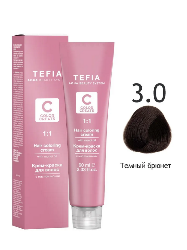 TEFIA ABS Крем-краска для волос с маслом монои, 60 мл Темный брюнет интенсивный 3.0
